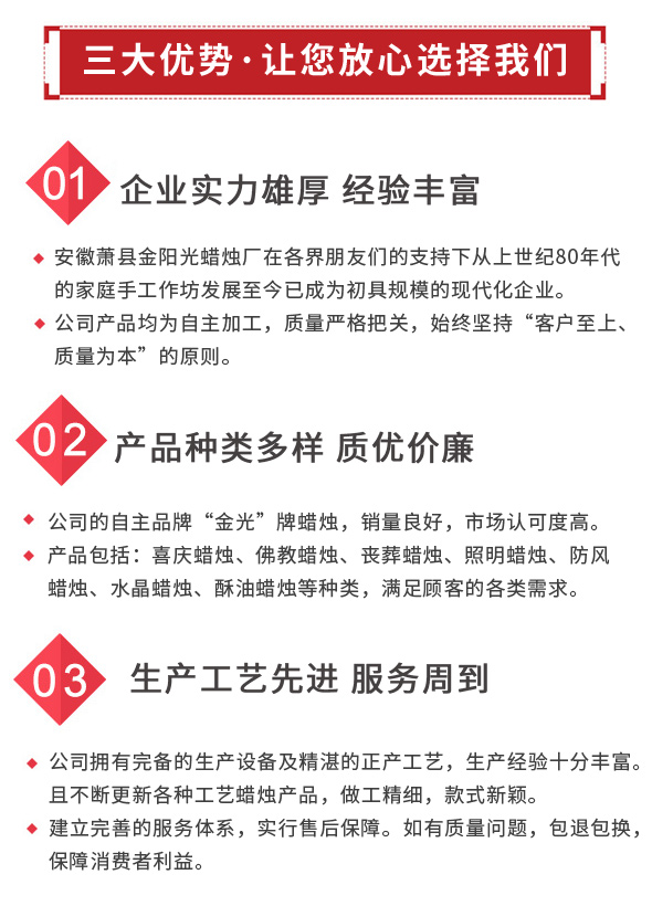 安徽省萧县金阳光蜡烛厂,厂址位于安徽省宿州萧县新庄镇。专业生产与销售各类蜡烛、工艺蜡烛、浮雕蜡烛、香薰蜡烛、植物蜡蜡烛、大豆蜡蜡烛、果冻蜡蜡烛、婚庆蜡烛、生日蜡烛、水果蜡烛、杆蜡、茶蜡、酒吧蜡烛、圣诞蜡烛、情人节蜡烛、 礼品套装蜡烛、卡通蜡烛、浮水蜡烛、各类铁罐罐蜡、玻璃杯灌蜡、陶瓷杯灌蜡、宗教蜡烛等系列;烛台有:工艺烛台、铁器烛台、欧式烛台、古典烛台、陶瓷烛台、仿古烛台、玻璃烛台、水晶烛台、婚庆烛台、树脂烛台、合金烛台、锡制烛台等产品。是国内较大的专业生产蜡烛基地。工厂拥有30多名熟练工人、高级设计、制造技术人员...